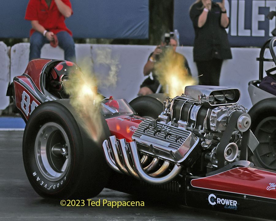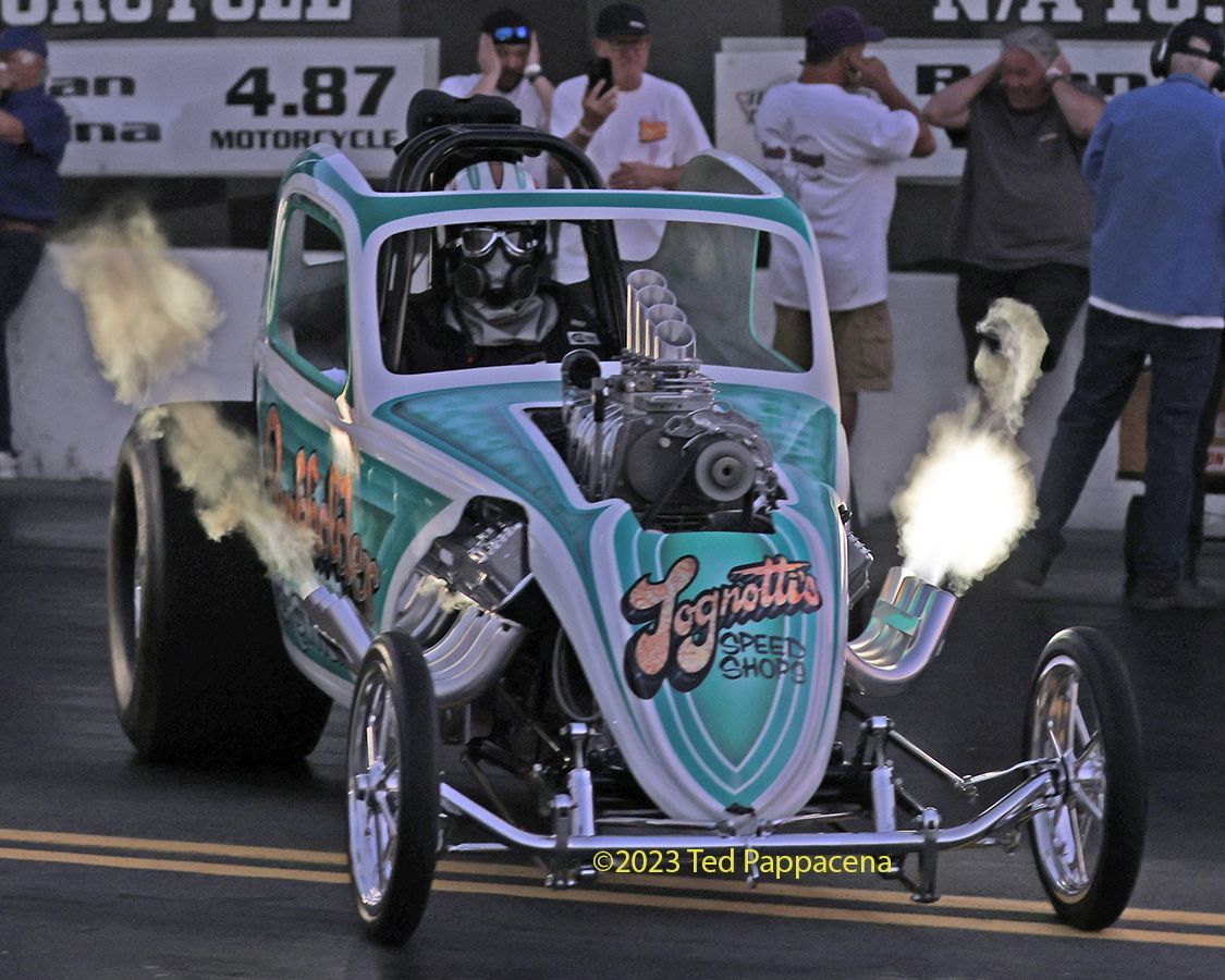 This is the main day of the event. A noise day and again it lived up to its name with cackles galore all day long as well as on track push starts for the dragsters and fuel altereds, as well as nitro exhibition runs, and like last year The Outlaw Gassers of Southern California. Adam Sorokin’s digger, Kazanjian & Lemon & Konno Mustang F/C, the Halstead “Over the Hill Gang” AA/FA, the Flournoy Family AA/FA, and Eily Stafford in a rear engine car, were just some of the cars making exhibition runs. The autograph session was as big as last years’. You could get signatures from the likes of Herm Peterson, Larry Brown, John Force, Jack Beckman, Linda Vaughn, T V Tommy Ivo, Gary Beck, Carl Olsen, Don Prudhomme, Frank Bradley, Glenn Way and a host of other notables. I had conversations with Gary Beck, Frank Bradley, and the owner of the Lil Old Whinemaker all steel Dodge Dart funny car (his name escapes me). It seemed that everything was going on all at once. You really had to choose what to do and see as the Southern California Outlaw Gassers were making their qualifying runs and fuelers were cackling all while long lines were gathering for the autograph session. So prior to all of this as I went to get on the track to shoot the action, I was told by a track worker I couldn’t go there. I showed him my media lanyard, gold speckled wristband, and white track wristband. “I don’t care about those”, says he. “You need a green fluorescent vest, go to the office and get one “. So I did. I went into the office and asked for said vest. Someone who I assumed was the track manager informed me that they didn’t have anymore. Twenty five certified media and the track has only 20 vests and everything else doesn’t matter. So I calmly asked “What am I supposed to do, not shoot the event?” “There’s nothing I can do”, says he. I left the office and went on the track anyway. This isn’t right.