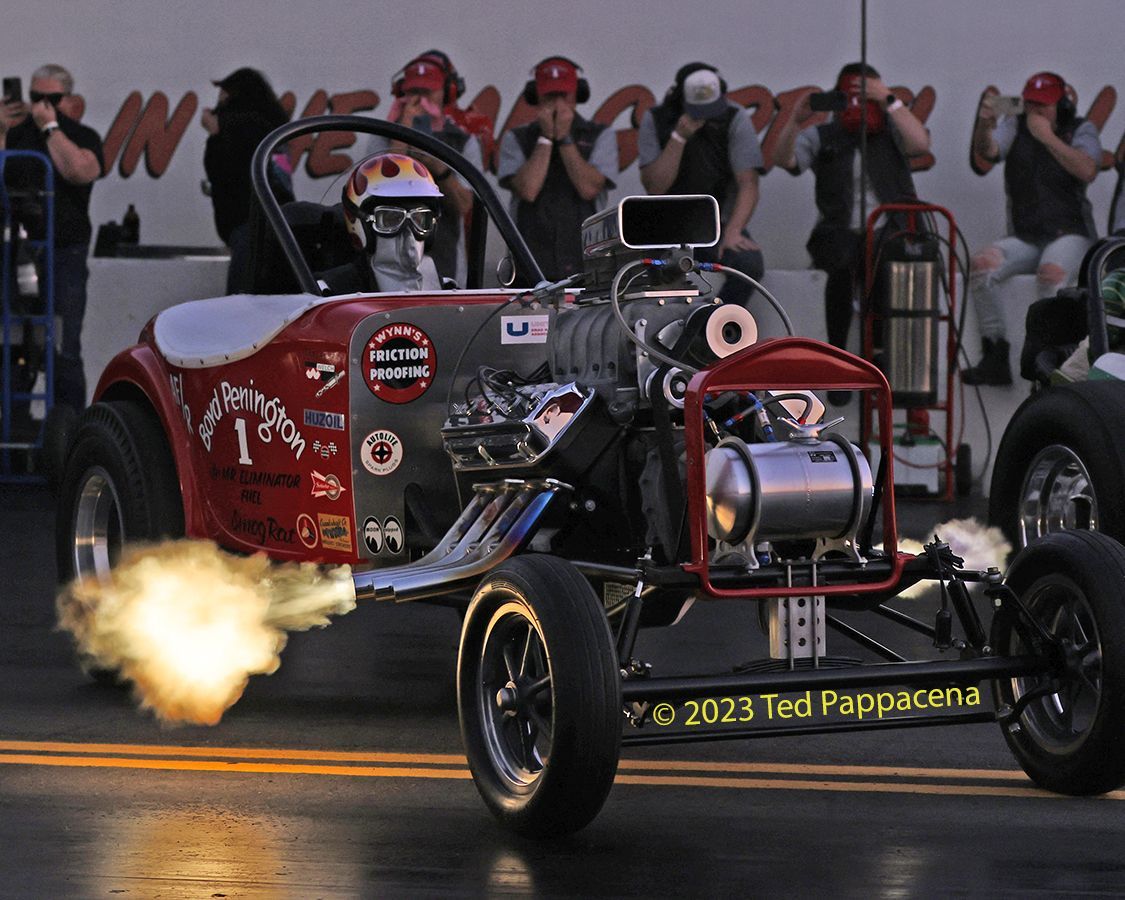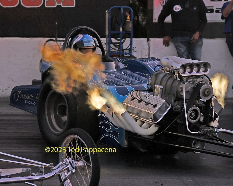 This leads us up to recognition awards to those involved in the Greater San Gabriel Valley drag racing scene. Recipients included Jim Dunn and Henry Valesco. After the awards, more push starts and gasser racing lead up to the Line of Fire. All of the cars are jockeyed into position and Cindy Gibbs starts them up a few at a time until they are all cackling at once. As a photographer I quickly learned from last years’ event that I had to pick and choose which cars to shoot as all do not produce the same amount of flames and there’s not a lot of time to do it. That’s what everyone comes to see. So I went to where the fire was so to speak. Along the way I saw some photographers on the track during this part of the event. Huh? I thought that absolutely no photographers are allowed on the track at all during the Line of Fire. So, why are they allowed? Are they better than the rest of us? But what do I know; I’ve only been doing this for 56 years. As I got to the end of the line of cars at the 1/8 mile mark, I was literally gasping for breath. There was that much nitro in the air. A very big yellow cloud hung over the track. Nitro overload for sure. The cacklefest ended with a fireworks display. Saturday’s events are over and the Pomona Posse heads over to Whittier for a Chicken dinner at the Chicken Coop with Pete Mauriello’s posse and then back to the hotel for much needed sleep because……..