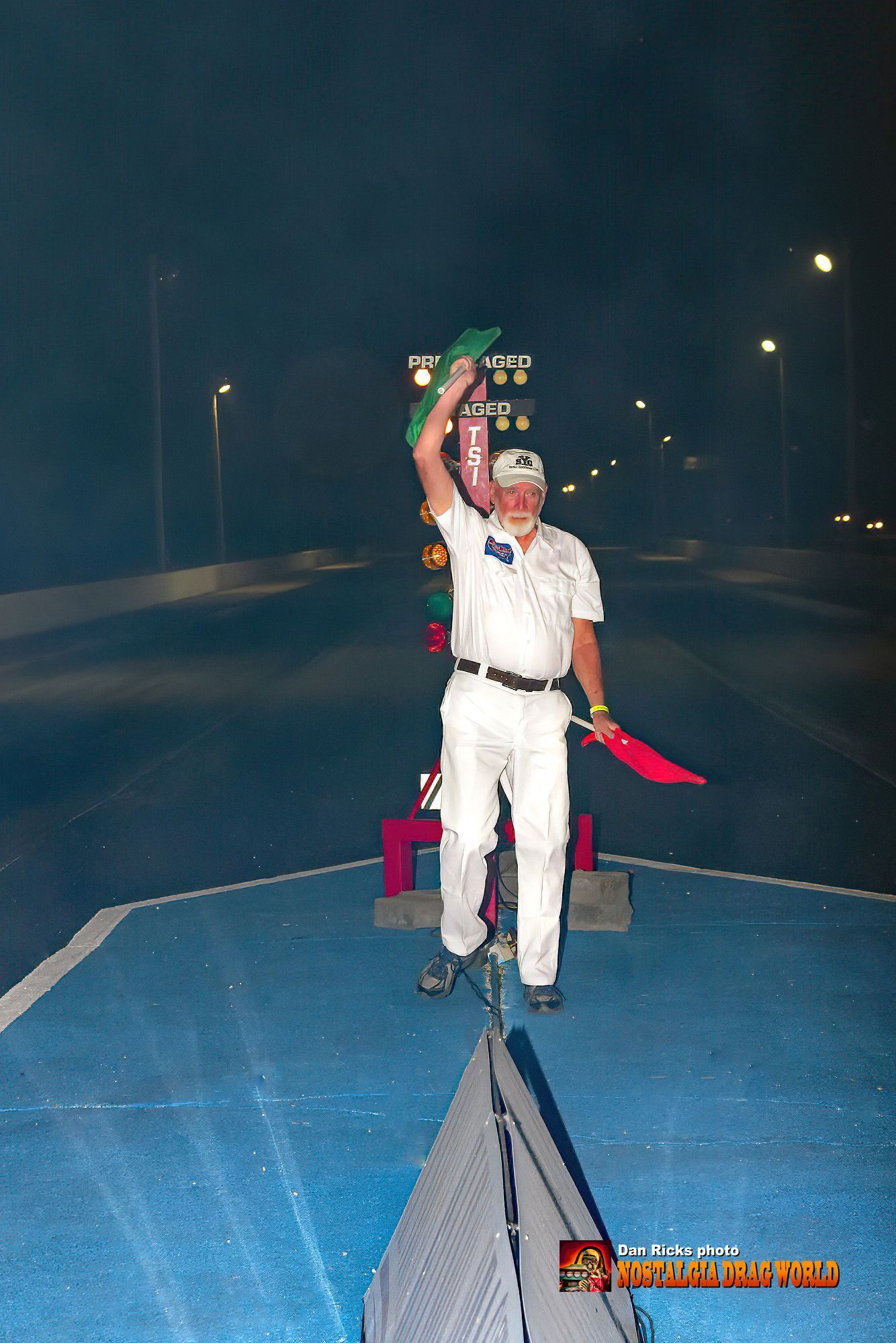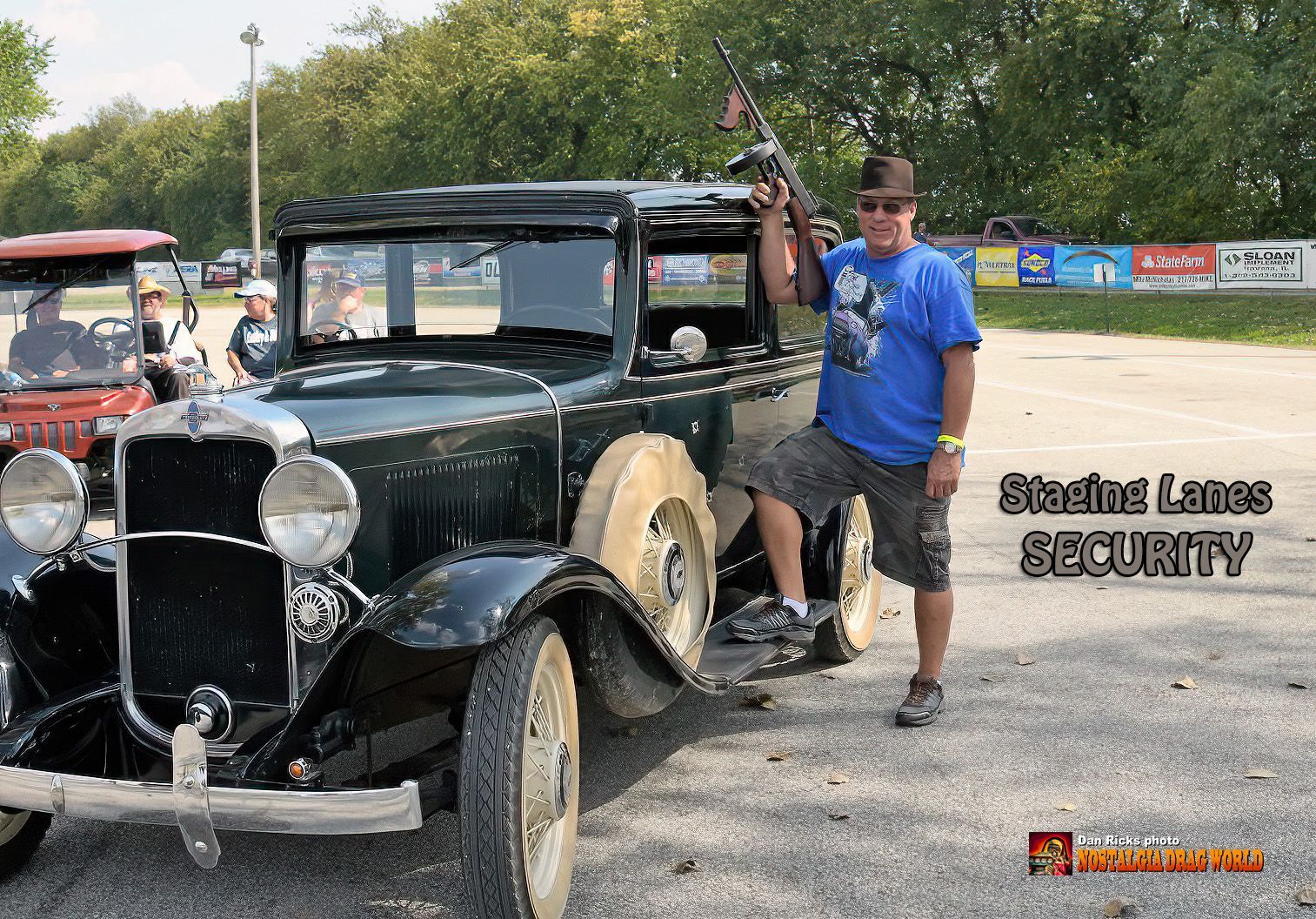 Sure, they had the usual gassers, nostalgia outlaw quick series, Ozark Mountain Super Shifters, nostalgia super stockers, a couple Promods and several blown alcohol vehicles but what really gave it that nostalgic feel were the 3 young ladies with the nostalgia super stock group dressed in their nostalgic looking outfits assisting with the backing and staging of the cars. Then there was a local racer posing as the staging lane security (see photo) but what really added a nostalgic twist to the event was local photographer, Dennis Cumby's flag drop starts for the super stock cars and gassers dressed in all white with the red and green flags in hand.