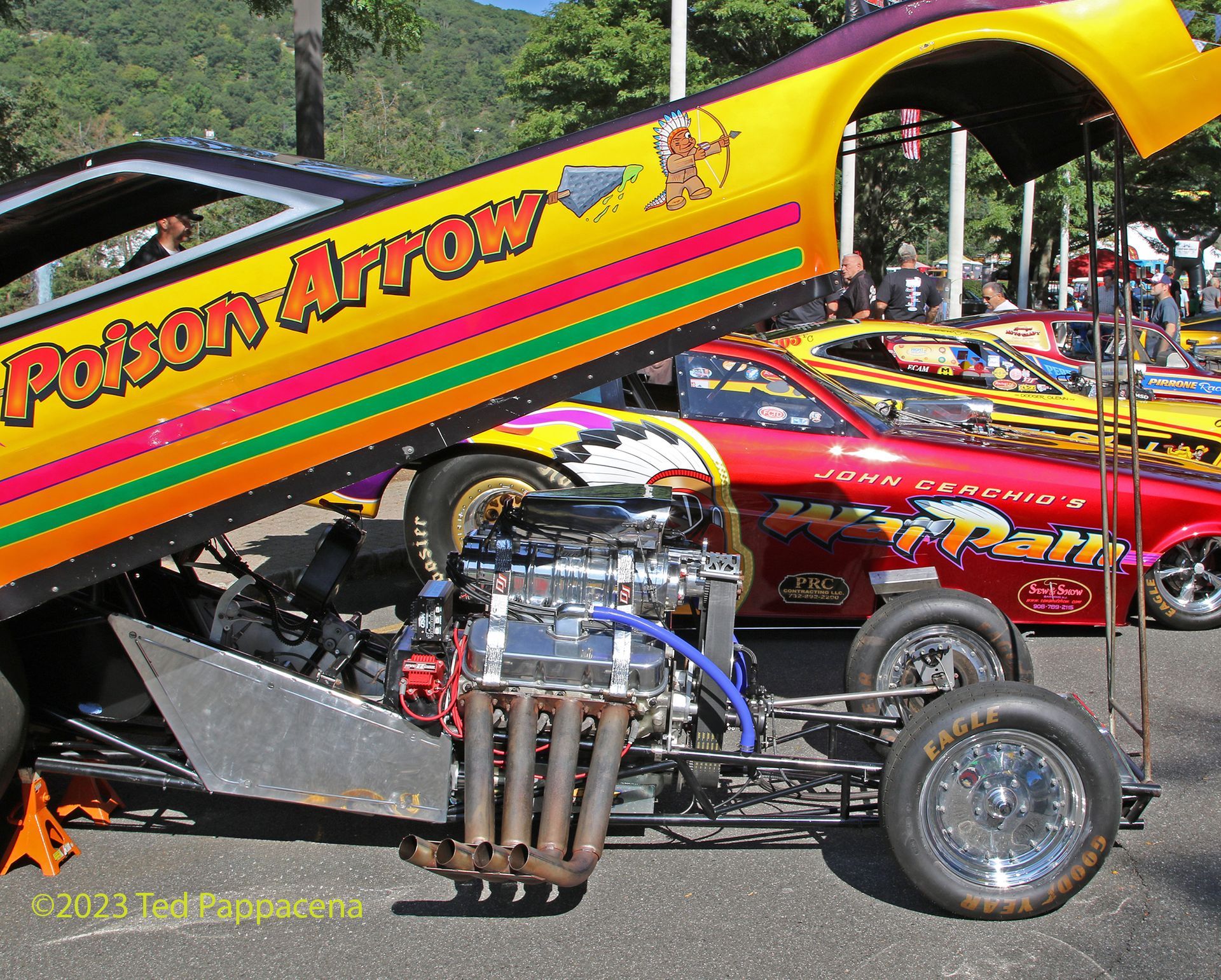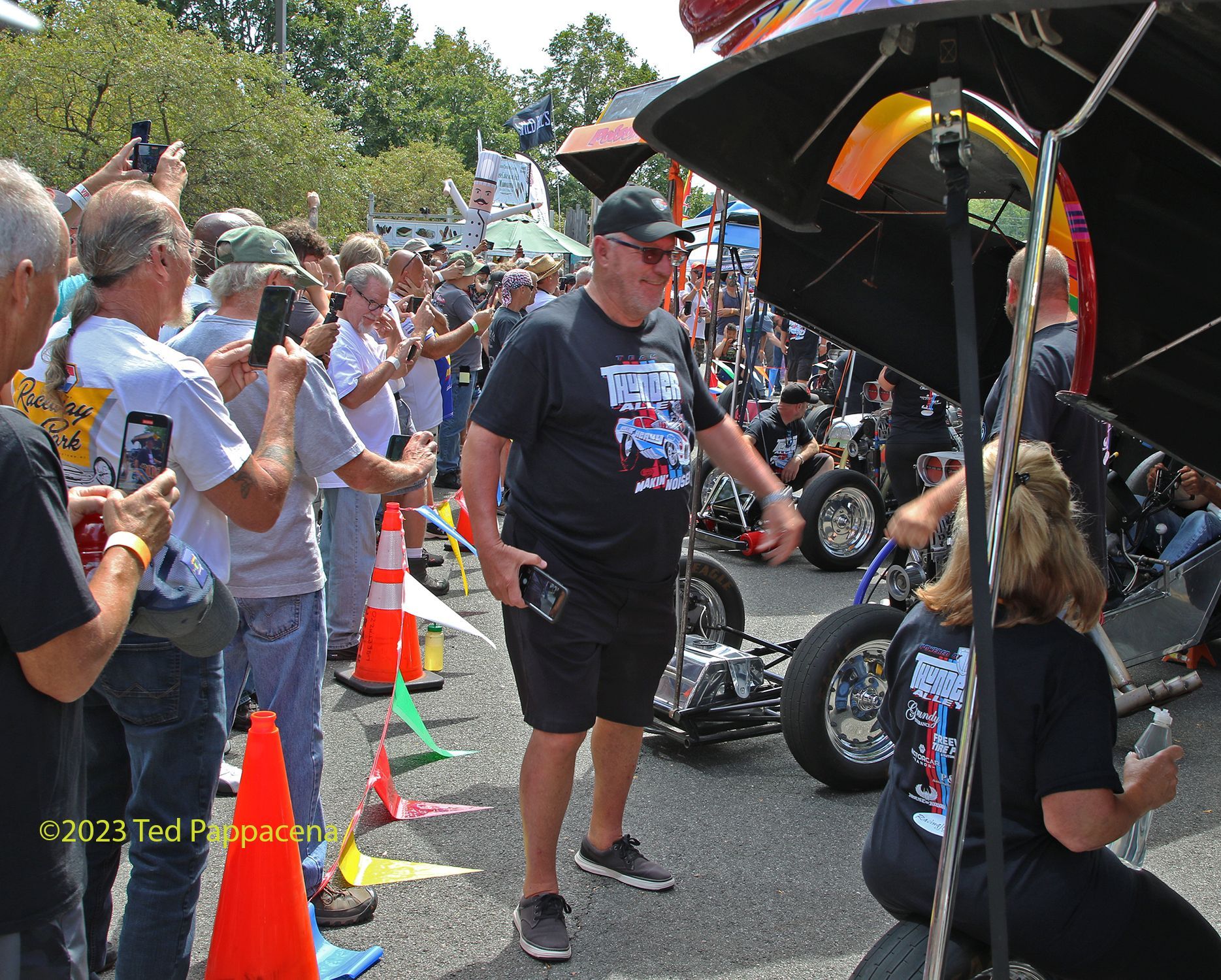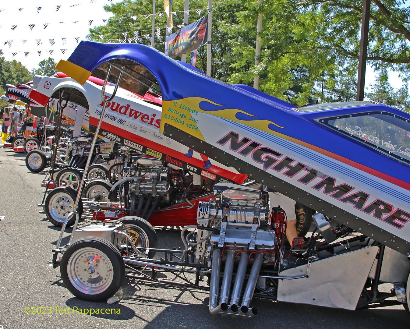 Yet another unplanned event and in New Jersey to boot! Dead Man’s Curve is a car show held each year on Labor Day Weekend at the Sheraton Hotel in Mahwah, N J. It’s not just a car show, it’s more like a car happening. Hot Rods, Rat Rods, Customs, Muscle Cars, Show Cars, Antiques (a few), trucks (a few), vendors, bands, food trucks and celebrities like Candy Clark and Charles Martin Smith from the movie American Graffiti and Butch Patrick better known as Eddie Munster. Oh yeah, and then there’s POR Presents Thunder Alley powered by Racing Junk. Thunder Alley is the brainchild of “Big” Al Liebman. Al has a long and storied past in drag racing and especially with funny cars. Ever since he first saw them at Englishtown (N J) in 1969 he wanted to be as involved with them as much as he could. Short of driving them he’s done everything else and is currently involved with the Super Camaro funny car as well as being Senior Sales Exec at Racing Junk. The idea of Thunder Alley in the beginning was to cackle a few cars for the audience (2 to be exact). It has since blossomed to over 25 supercharged funny cars, front engine dragsters, a fuel altered, and a wheelstander! All cackling on healthy doses of alcohol and nitro. The cars are lined up on the road adjacent to the hotel entrance and 3 times a day all 3 days, they are cranked up and cackled. And it’s LOUD! I was standing between War Path and the Frantic Ford and it was total sensory overload. Highly recommended! The crowd applauds and roars in approval. This year’s participants included;