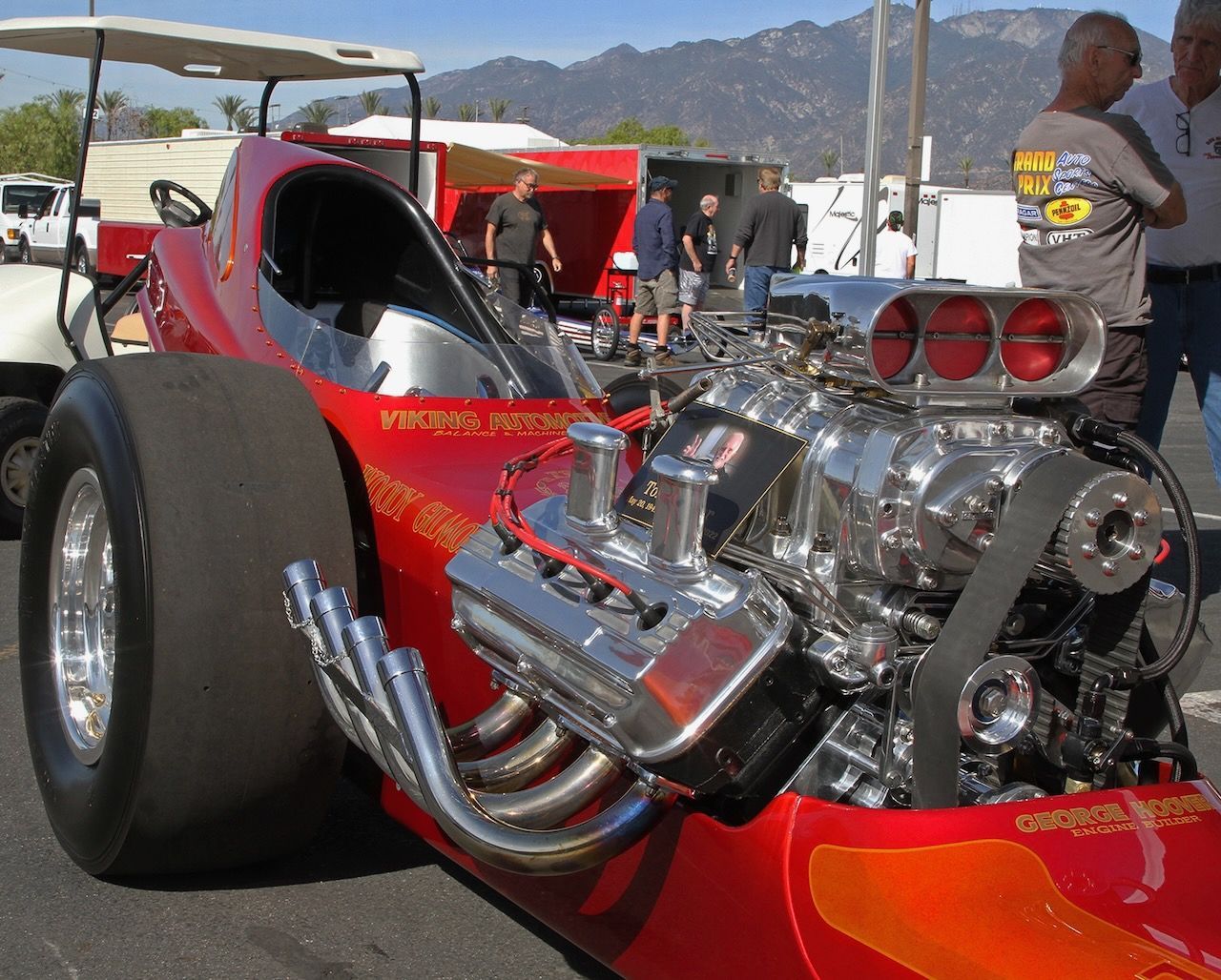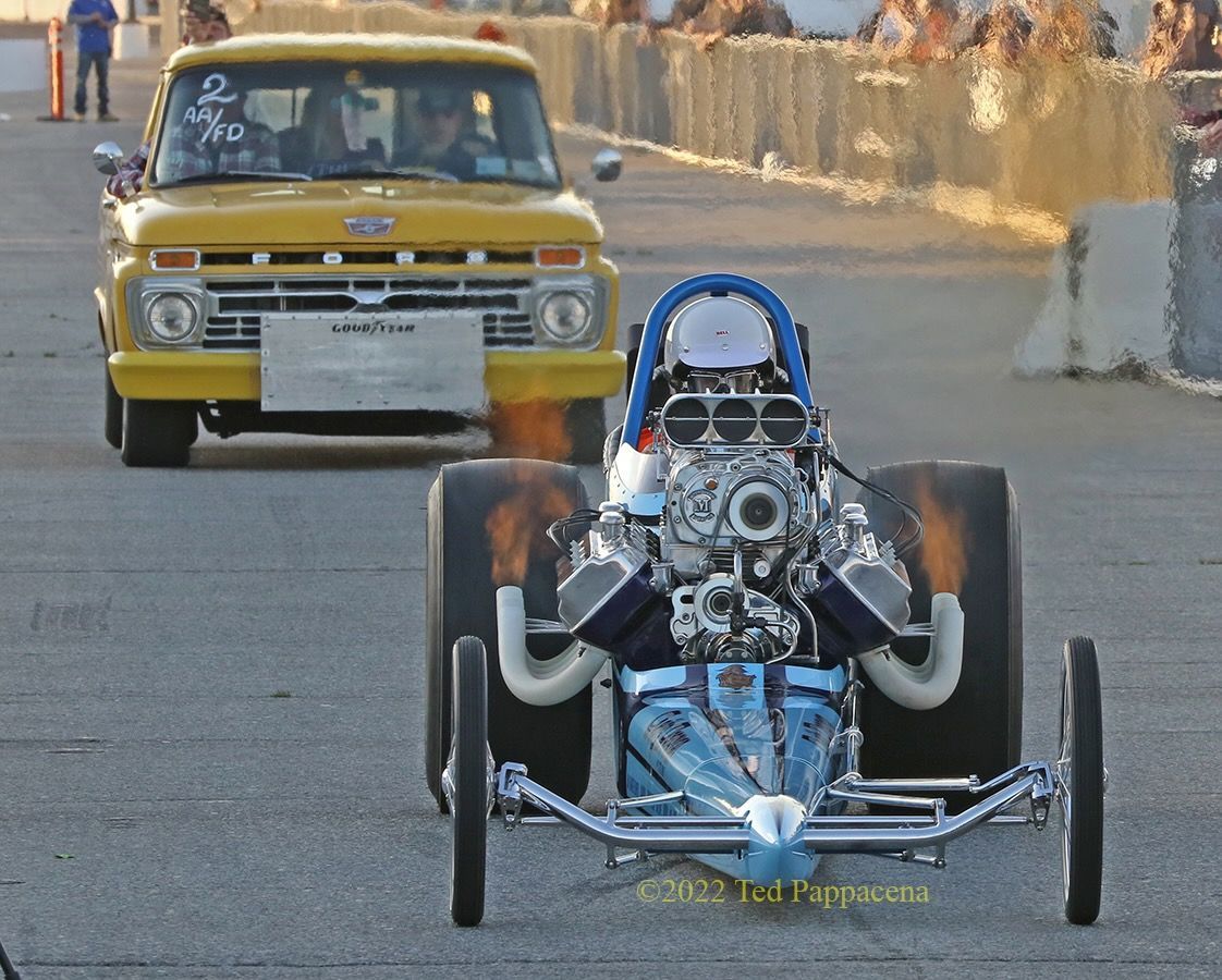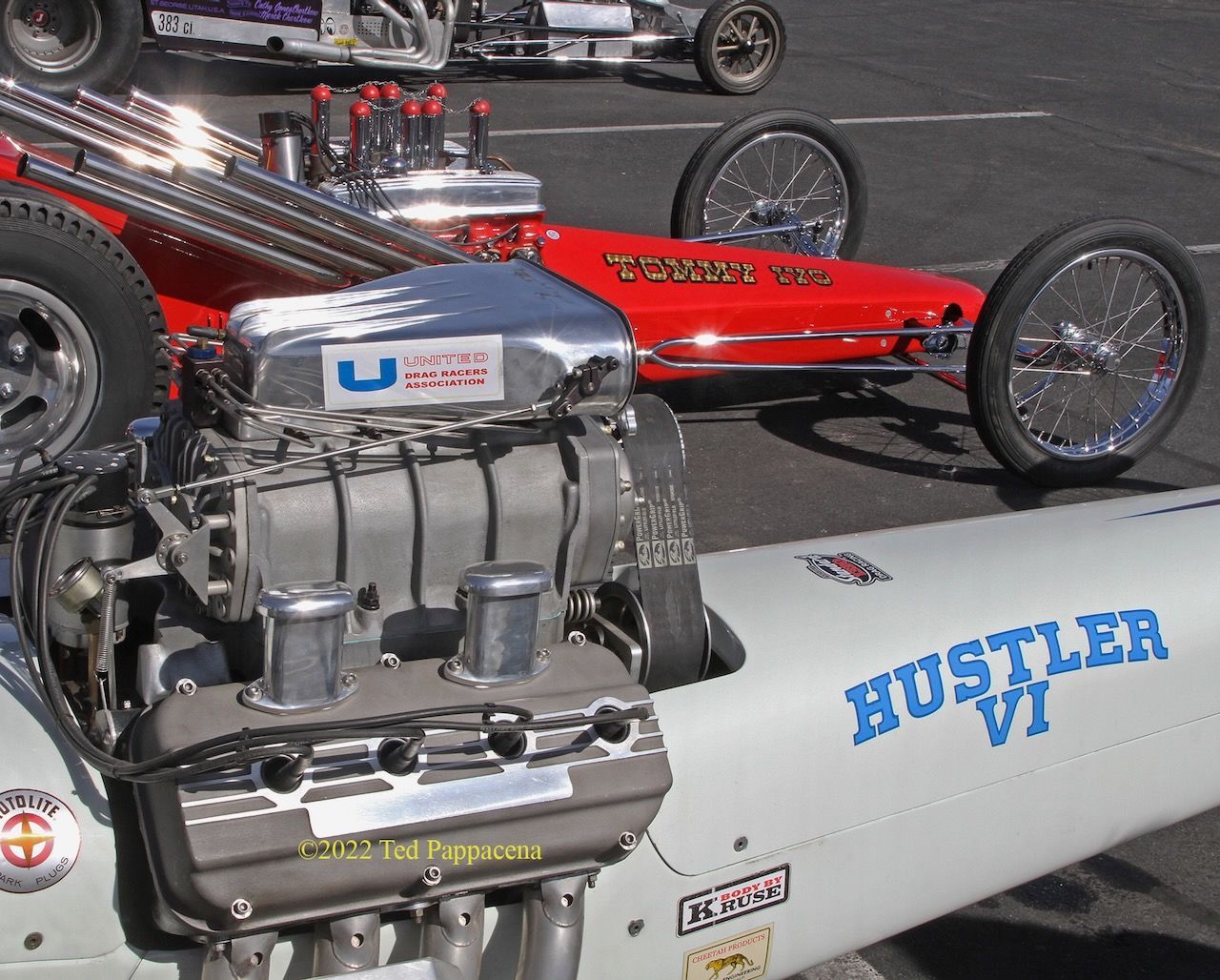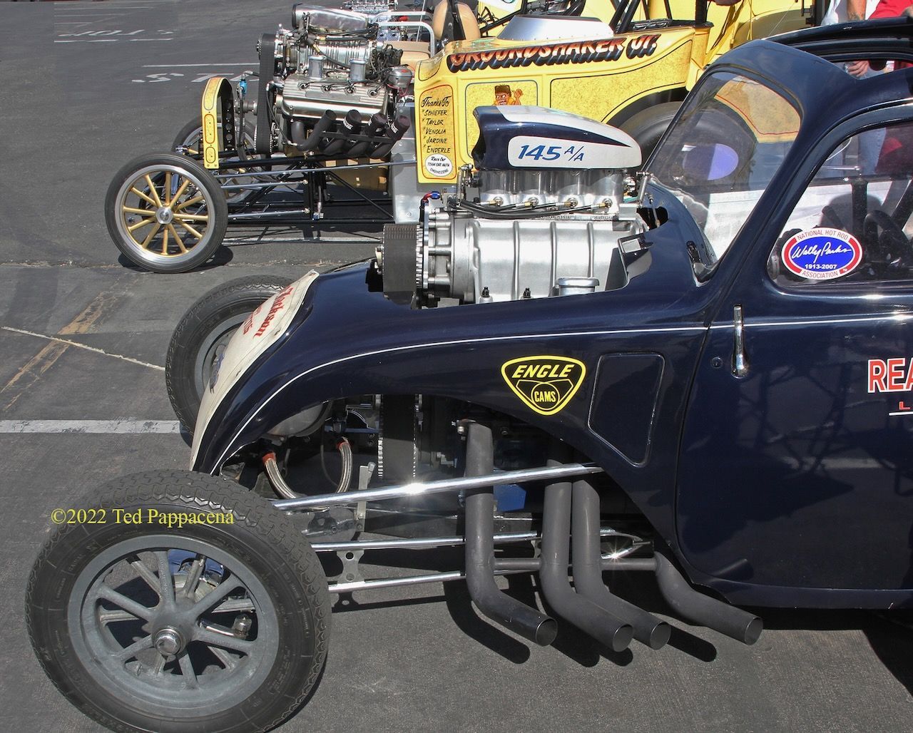 Everywhere I looked was history; the late Tom Hoover’s Tom Hanna built dragster( stunning doesn’t come close to describing it), the Billy Lynch dragster, John Weibe, the Surfers, Doug Thorley’s Corvair, Don Garlits’ Swamp Rat III, Creitz & Donovan, Mike Kuhl, Flaming Frank Pedregon’s fuel coupe, Hustler VI, Tommy Ivo’s injected Buick, Holy Toledo Jeep, Newhouse Special, Magicar, the Spaghetti Benders, Bivens & Fisher Checkmate, Custom Body Challenger, and at least 8 fuel altereds. Being from the east coast I could count the number of fuel altereds I’ve seen on my left hand. In one row were the Stone T, Burkholder Brothers Fiat, Groundshakers Jr, Magnificent 7, Beaver Hunter II, and the Rat Trap to name a few. My head was spinning! There are over 30 gassers on the grounds including Rick Osburn’s 38 Special and Gene Schwartz’s Chevy as well as the gassers that were on display only. Gassers on display only included Rocky Pirrone’s knock out Big John Mazmanian Willys, The SWC Swindler A Willys, Bob Panella’s Panella Trucking Anglia and Willys pickup and the Kroona Anglia. Quite honestly there were too many cars to list without leaving one out. Actually there were 4 cars on the grounds that I ever saw in person; the Custom Body Challenger at Indy in 1973, Billy Lynch’s AA/FD (upon completion and shipped to Billy’s shop in 2007), Bradford’s Fiat AA/FA and the Rat Trap AA/FA at the 2013 New England Hot Rod Reunion. The rest that I saw was just history unravelling right before my eyes. Thanks to my good friend Ross Howard (Custom Body Challenger) who became a famous driver spotter, pointed out Herm Peterson, Vance Hunt, Frank Bradley, and Tommy Ivo to name a few who I met and got to talk to. By my estimate, I shot about 1000 photos from the time I got there to the time I left after sunset. The day was capped off with a dinner by event sponsor In-N-Out Burger. A voucher purchased for $10 (donated to charity) got you the famous Double-Double Burger, fries, and beverage of your choice. Considering prices in California, it was a pretty good deal. After dinner, there was a bench racing session around a pickup in the parking lot capped off with more bench racing at the hotel, and then off to bed.