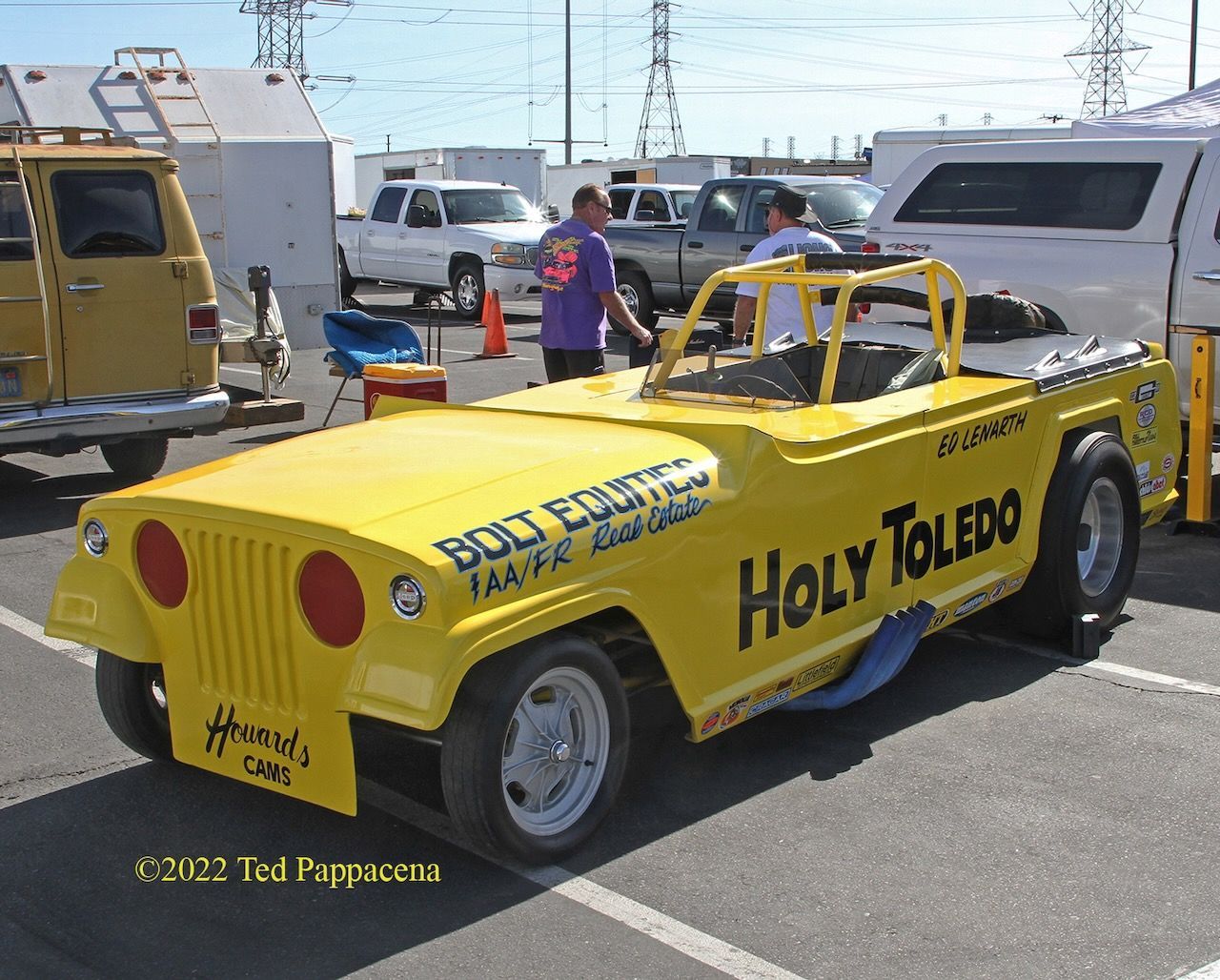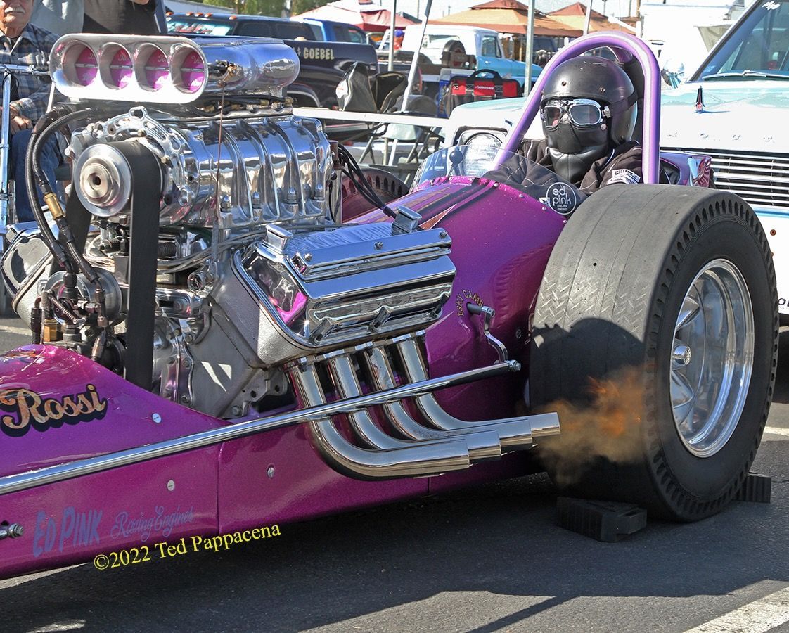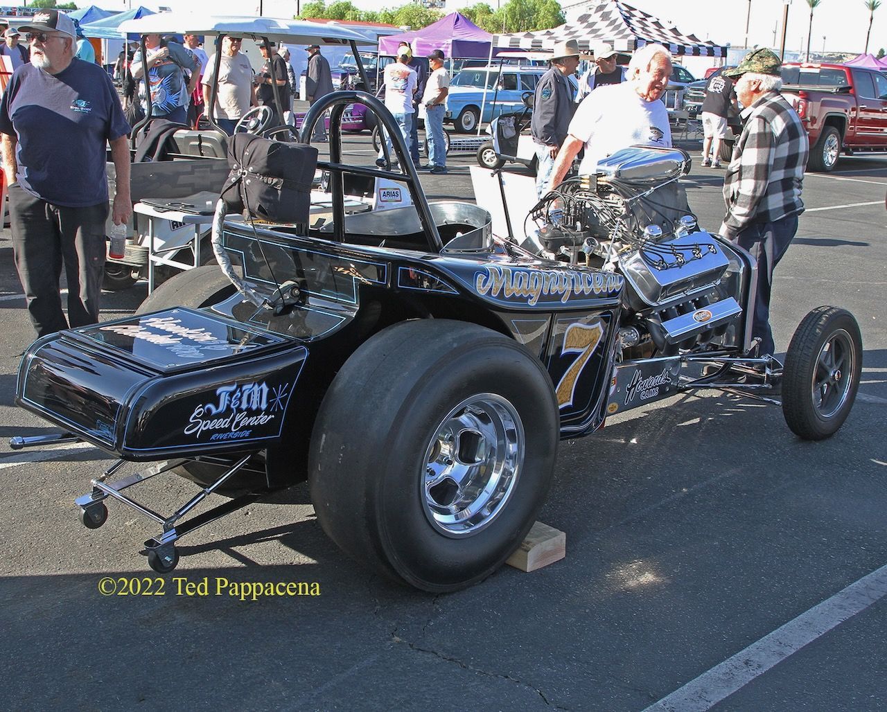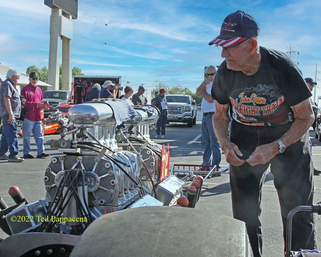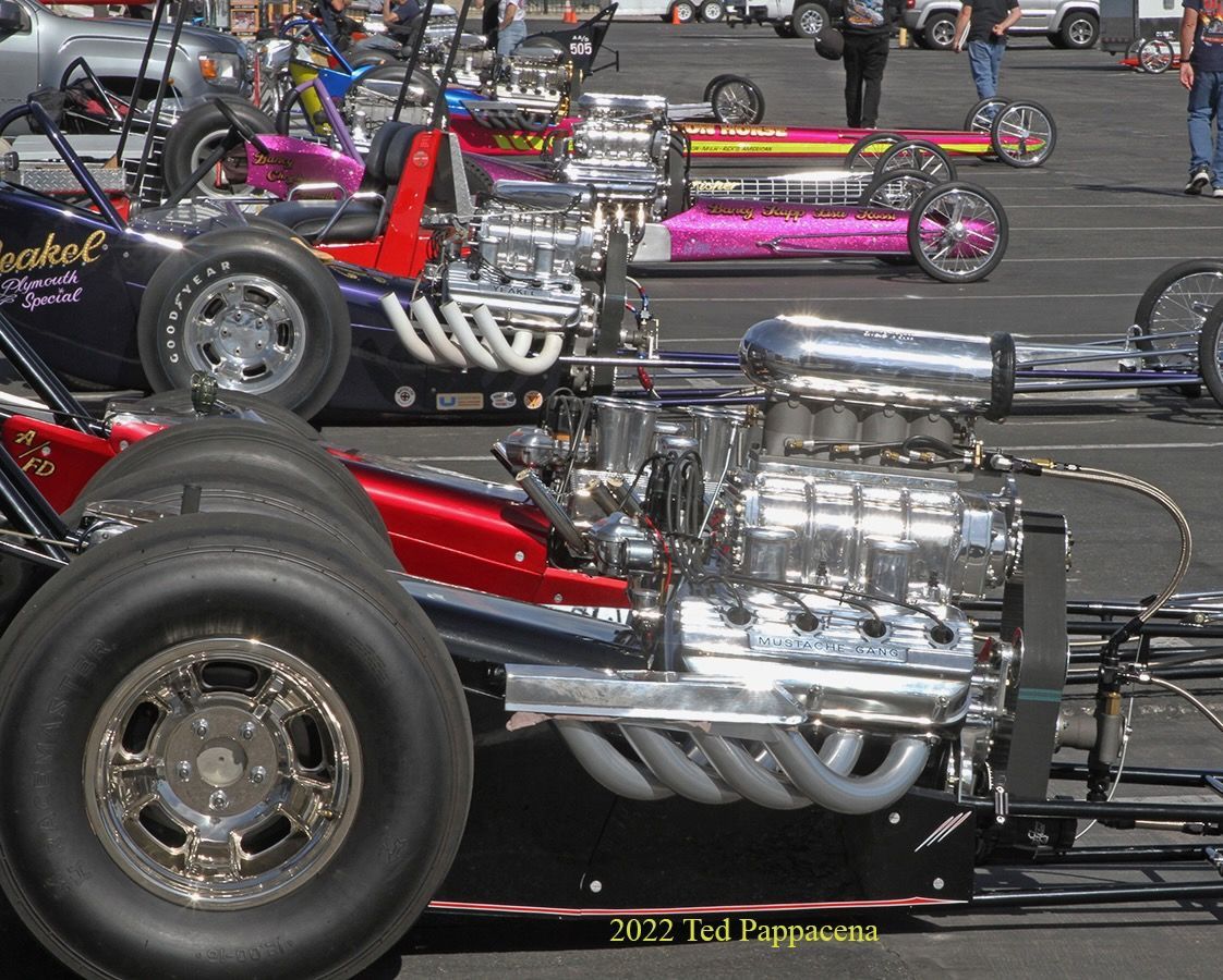 Everywhere I looked was history; the late Tom Hoover’s Tom Hanna built dragster( stunning doesn’t come close to describing it), the Billy Lynch dragster, John Weibe, the Surfers, Doug Thorley’s Corvair, Don Garlits’ Swamp Rat III, Creitz & Donovan, Mike Kuhl, Flaming Frank Pedregon’s fuel coupe, Hustler VI, Tommy Ivo’s injected Buick, Holy Toledo Jeep, Newhouse Special, Magicar, the Spaghetti Benders, Bivens & Fisher Checkmate, Custom Body Challenger, and at least 8 fuel altereds. Being from the east coast I could count the number of fuel altereds I’ve seen on my left hand. In one row were the Stone T, Burkholder Brothers Fiat, Groundshakers Jr, Magnificent 7, Beaver Hunter II, and the Rat Trap to name a few. My head was spinning! There are over 30 gassers on the grounds including Rick Osburn’s 38 Special and Gene Schwartz’s Chevy as well as the gassers that were on display only. Gassers on display only included Rocky Pirrone’s knock out Big John Mazmanian Willys, The SWC Swindler A Willys, Bob Panella’s Panella Trucking Anglia and Willys pickup and the Kroona Anglia. Quite honestly there were too many cars to list without leaving one out. Actually there were 4 cars on the grounds that I ever saw in person; the Custom Body Challenger at Indy in 1973, Billy Lynch’s AA/FD (upon completion and shipped to Billy’s shop in 2007), Bradford’s Fiat AA/FA and the Rat Trap AA/FA at the 2013 New England Hot Rod Reunion. The rest that I saw was just history unravelling right before my eyes. Thanks to my good friend Ross Howard (Custom Body Challenger) who became a famous driver spotter, pointed out Herm Peterson, Vance Hunt, Frank Bradley, and Tommy Ivo to name a few who I met and got to talk to. By my estimate, I shot about 1000 photos from the time I got there to the time I left after sunset. The day was capped off with a dinner by event sponsor In-N-Out Burger. A voucher purchased for $10 (donated to charity) got you the famous Double-Double Burger, fries, and beverage of your choice. Considering prices in California, it was a pretty good deal. After dinner, there was a bench racing session around a pickup in the parking lot capped off with more bench racing at the hotel, and then off to bed.