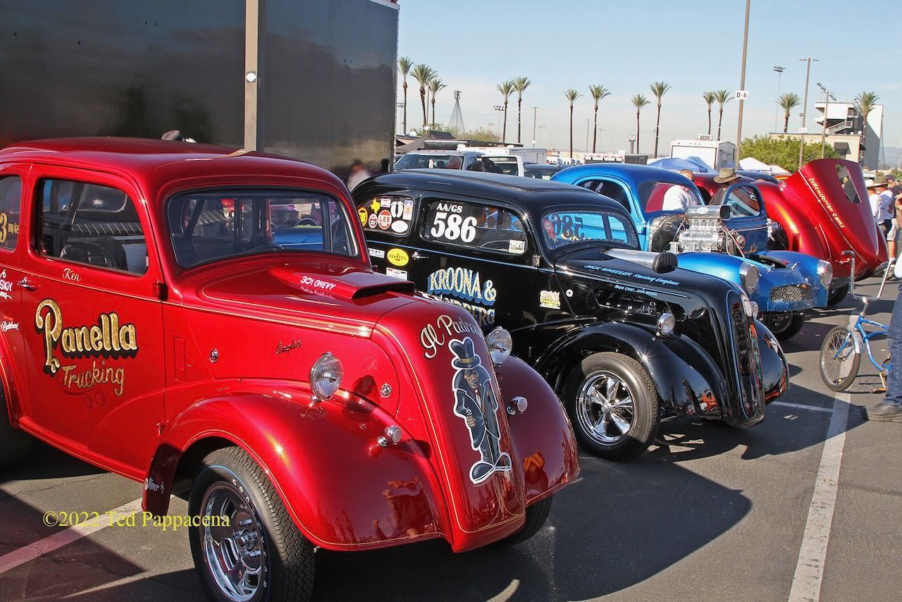 So now comes the crazy part of the trip. Since we were so close to the Fairplex, we decided to go see the track. A track we’d only seen in magazines or on television when either the Winternationals or Finals are held. We really wanted to get some photos with the mountains in the background. We pulled up to the entrance and told the attendant our intention was only to get a few photos and leave. But you know what they say about plans. As we travelled on the road to the track, we found ourselves adjacent to the suites and starting area. There was an opening so we went through it and promptly found ourselves on the track. So naturally we all got out and started taking pictures. At this time it’s good to note that we are now 1 week away from the NHRA Finals where champions will be crowned. I did mention to the group that to get the iconic photos of the track with the mountains in the background, we needed to go to the 1000’ mark and shoot facing up the track. We all go back to the car and since we were there, might as well make a pass and we did just that. This would make the second pass I’ve ever made on a dragstrip this year (or ever in my 56 years attending the drags); the first being at South Mountain Dragway in owner Mike Natoli’s pickup at the end of a Vintage Drags event held there in April of this year. Two passes in 1 year almost 3000 miles apart. At the 1000’ mark we got out yet again and took more photos. That’s just about when I noticed a white pickup heading our way coming up the track behind us. The driver then stops where we are shooting and says something pretty much like “What the f&#k is going on here?” We tell him but he’s having none of it. Well it turns out he’s a head honcho with NHRA and he’s tasked with getting the track ready for the finals. He also added that the track surface was recently painted in all the appropriate areas with red, blue, and yellow lines and just how did we get over here without running over them? Clearly the areas were dry but he was still not having any of it. It was then that I sensed we were in escalating trouble so I went up to him and explained that were in town for NR 5 and just wanted to see the place, get a few pictures and leave. He calmed down somewhat and saw that we meant no harm and said “YES-JUST-GO!” Whew, dodged a bullet right there. But ya know there was an opening after all, and why wouldn’t, oh never mind.