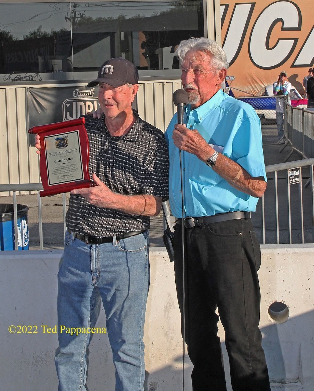 A bit later on, the Greater San Gabriel Racers Recognition Awards were given out at the track. Racers who received awards were; Gas Ronda, Bill Schultz, Doc Conroy, Jim London, Stan Adams, Charlie Allen, Don Ratican, Don Gaide, and the late Kenny Safford. The last three were collectively known as the “Sour Sisters” a name bestowed upon them by Tommy Ivo. Special “Spirit of Nitro recognition awards were also given to Nitro Revival volunteers Toby Denham and Tommy Naccarato. Congratulations to all!