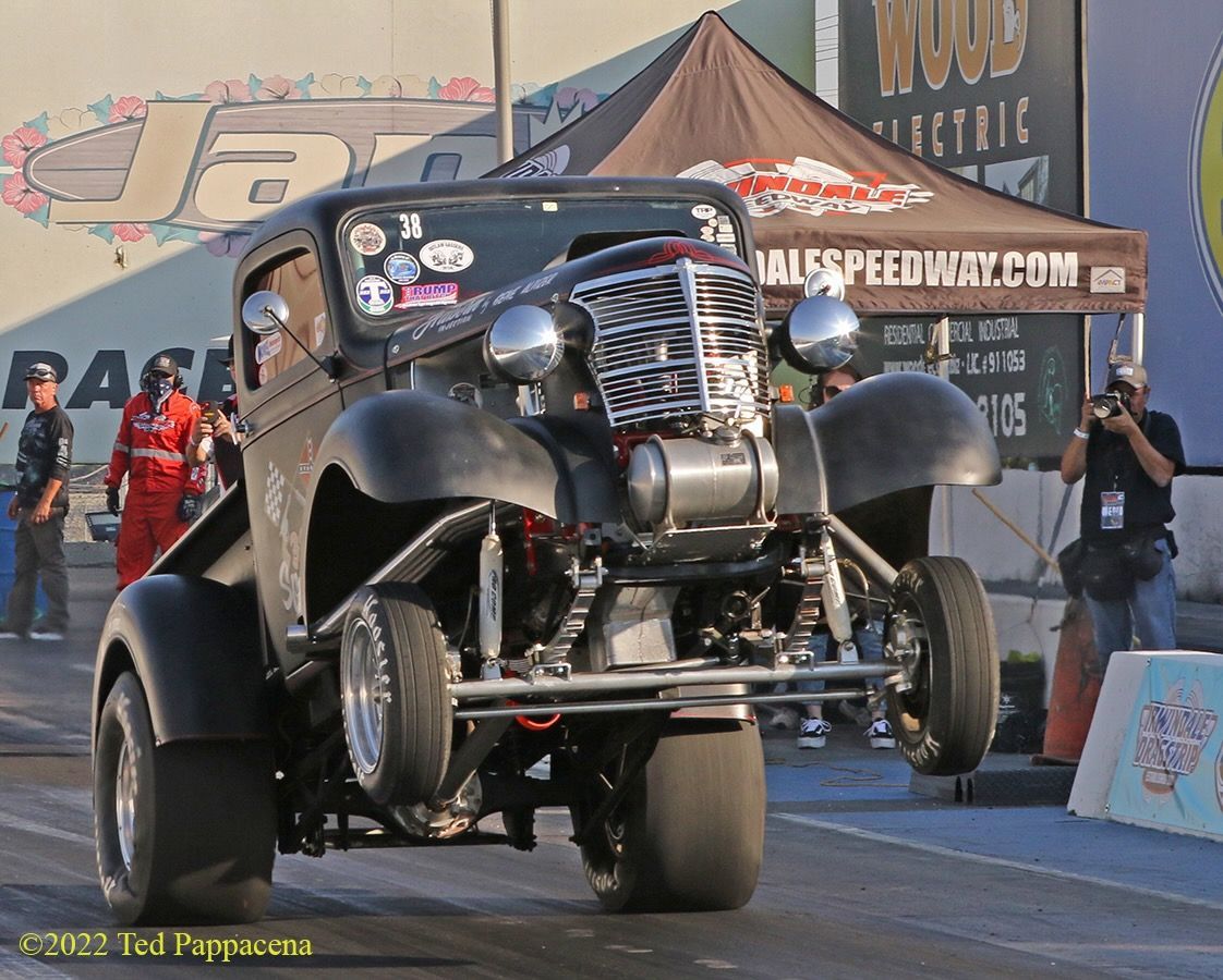 All this leads up to the evening’s featured event; the “Line of Fire” cacklefest. It was simply sensory overload. Flames, noise, and nitro! What’s not to like? I got some great advice from new pal photographer Dan Kaplan about positioning myself so I wouldn’t get overwhelmed with nitro fumes. Sage advice but I still got a very healthy (or unhealthy depending how you look at it) dose. The cars were started two at a time beginning at the Christmas Tree and ending at the 1/8 mile mark at the end of the track. Once all the cars were lit and running it was hard to keep track what car was producing the most flames. So much cackling but I did witness Cindy Gibbs literally dancing from one end of the track to the other while all this was going on. She was clearly in the nitro zone! Just as it was ending, a display of fireworks closed out the event for the day. Off we went with event sponsor Good Vibrations representative Pete Mauriello to a dining establishment called the “Chicken Coop” in Whittier for a good dinner. Then home to the hotel with more bench racing and on to bed. But wait, there’s more!